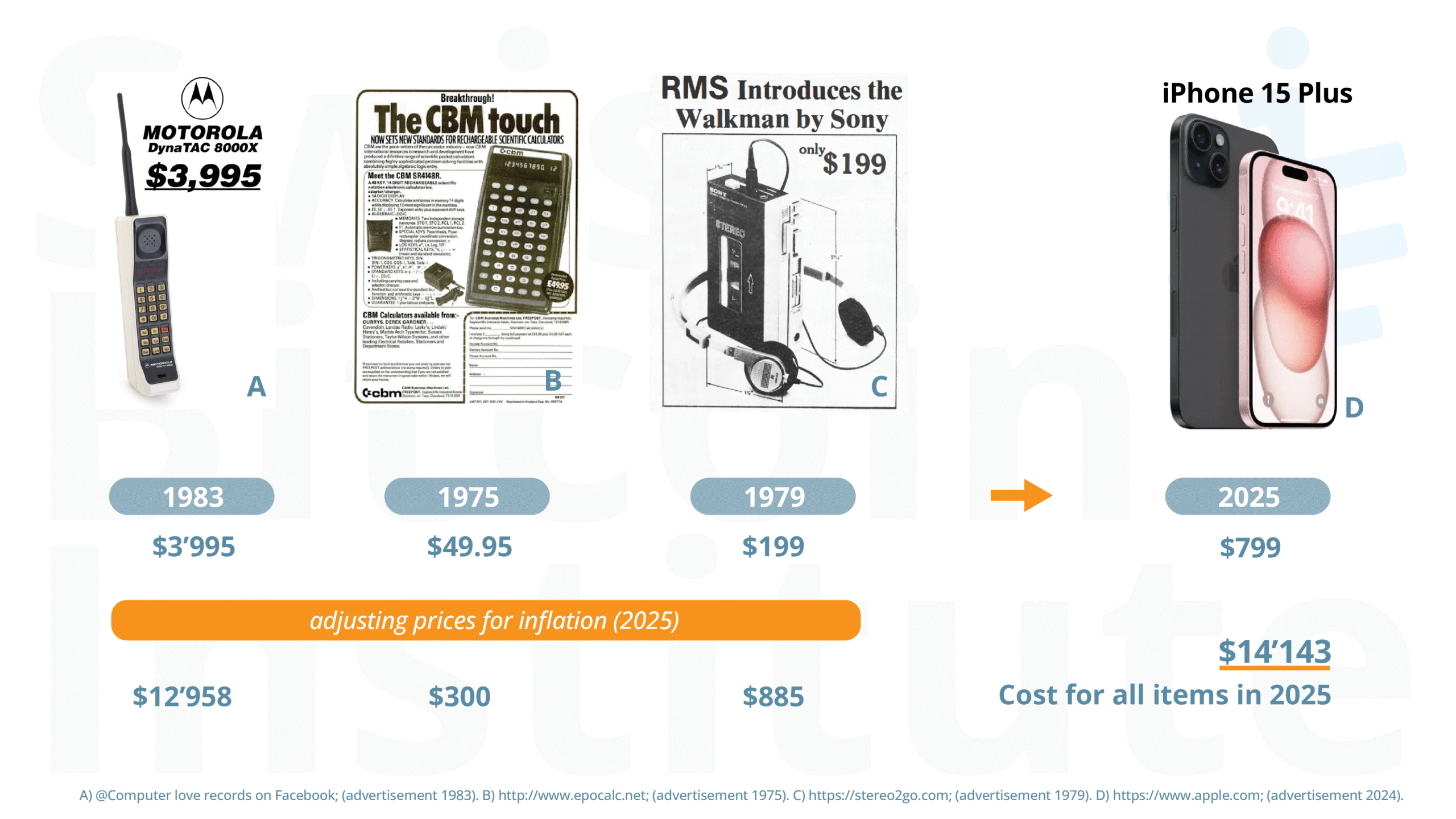 Figure 2: Technology's deflationary effect: more value for less. Representative historical examples of consumer electronics showing that technological progress drives prices down while functionality improves.