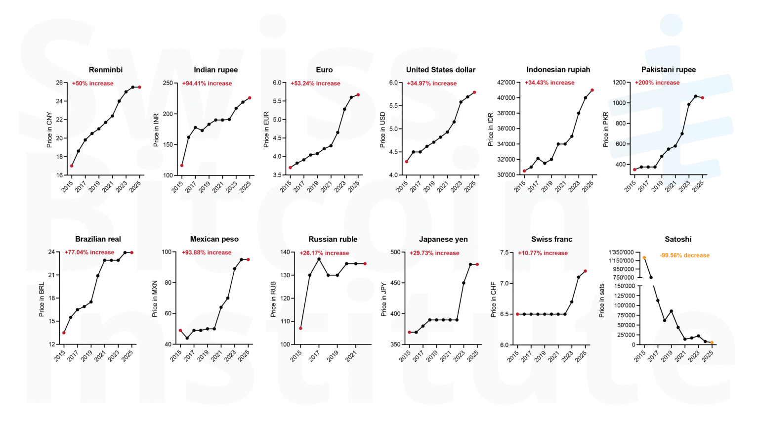 Figure 3: Big Mac price development in fiat currencies and Bitcoin (2015-2025). Annual Big Mac prices (2015-2025) are shown in local currencies for the ten largest currency zones by population represented in The Economist Big Mac Index (July data preferred, January otherwise) [20], with the Swiss franc (CHF) added for institutional relevance. The set includes CNY (China), INR (India), EUR (euro area), USD (United States), IDR (Indonesia), PKR (Pakistan), BRL (Brazil), MXN (Mexico), RUB (Russia, data until 2021), JPY (Japan). NGN (Nigeria) and BDT (Bangladesh) would normally qualify by population but are not in the dataset. Bitcoin prices (1 BTC = 100,000,000 sats) are shown as the number of satoshis (sats) needed to buy one Big Mac. To calculate this, the annual average BTC/USD price was used to determine how many sats equal one USD, and this was multiplied by the Big Mac's USD price.